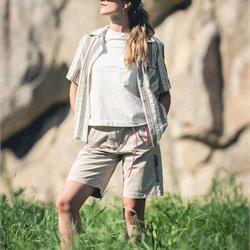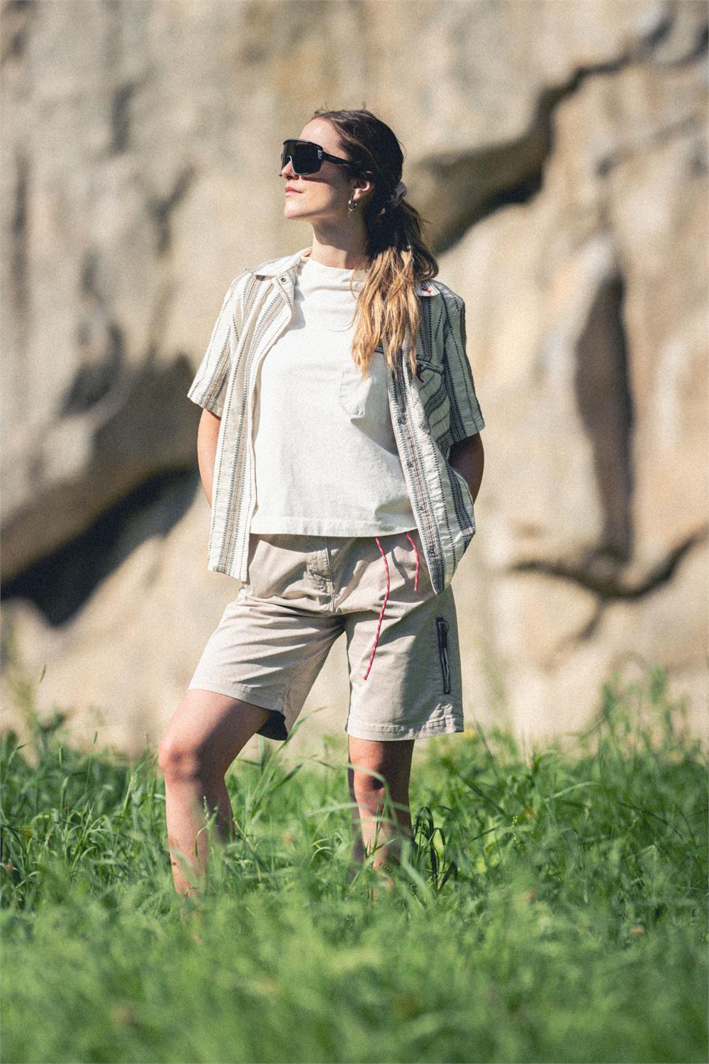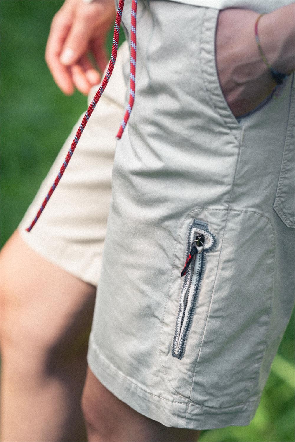 The Avista Tailored Short merges refined tailoring with outdoor functionality, bringing the design and attention to detail of Italian artisanal trousers into the world of climbing and adventure. The Italian-inspired tailored cut is reinterpreted with a modern fit, designed for outdoor movement. Made from durable stretch cotton, the fabric ensures exceptional freedom of motion, while the gusseted crotch allows for wide and lateral movements without restriction. The waistband is both structured and elasticated, featuring an internal elastic band, a stitched binding finish, and a small back vent for enhanced comfort. An internal panel covers the fly and crotch seams, maintaining a clean aesthetic and eliminating irritation. For a secure and adjustable fit, the short features a double-button closure and a Kevlar climbing cord, fine-tuned with a minimalist stopper. The cord remains securely in place thanks to dual-opening belt loops, preventing it from shifting even when worn oversized. A rear yoke enhances the fit, ensuring a contoured shape around the lower back. With two front hand pockets and two applied back pockets, the design balances practicality and style. These details allow for a customizable fit, offering both a slim and oversized silhouette without compromising comfort or performance. As with every Avista piece, the signature element remains: a climbing piton-shaped buttonhole framing the zippered pocket on the left thigh—an emblem of outdoor spirit and technical excellence.