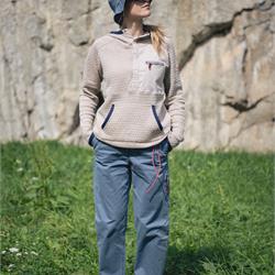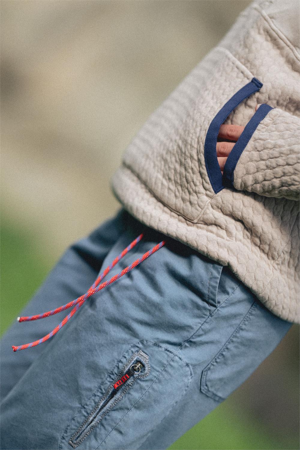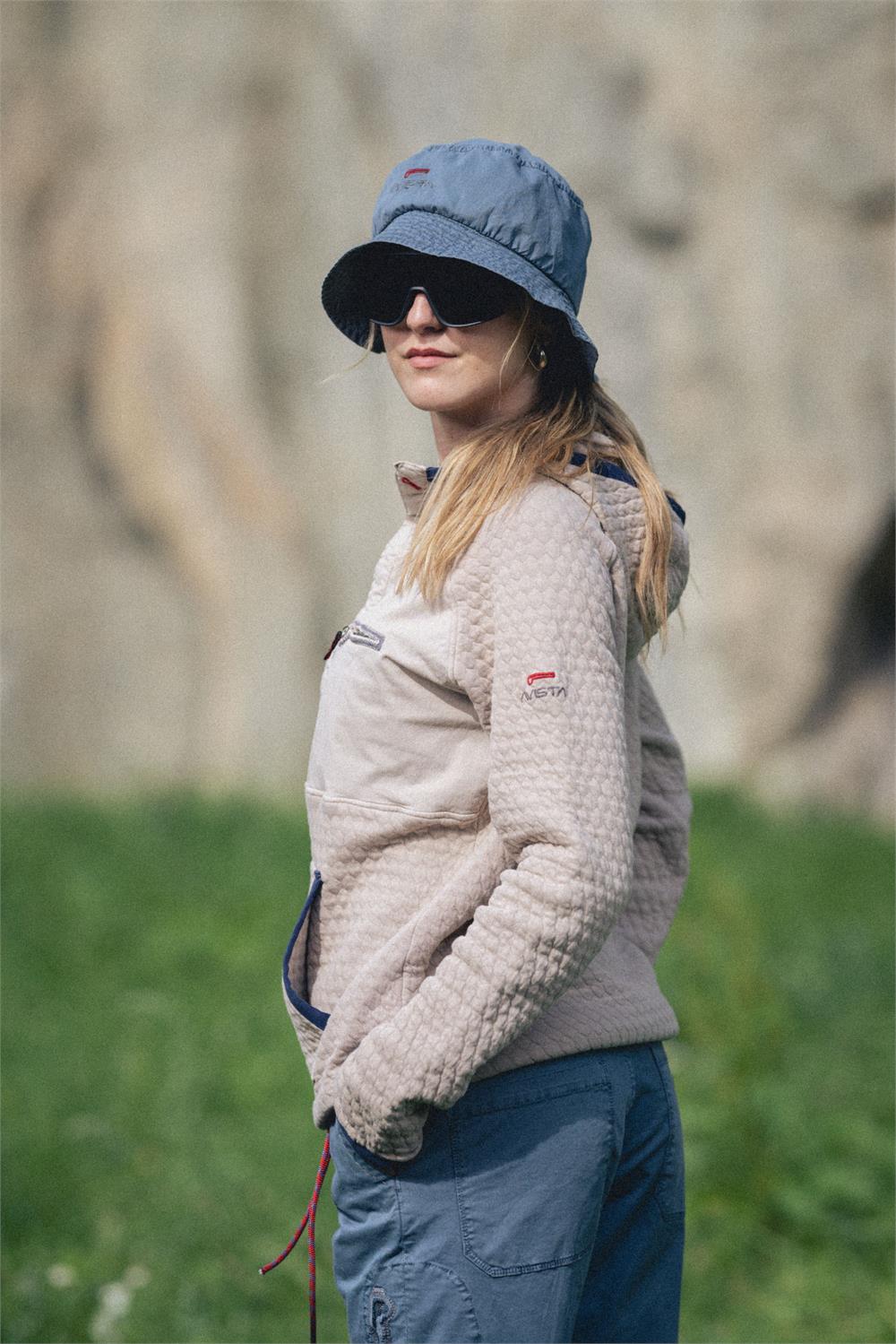 The Avista Kangaroo Hoodie is a casual-cut hoodie with raglan sleeves, designed to deliver everyday comfort and functionality in outdoor environments. Crafted from a 4-way stretch fabric with a 3D honeycomb structure, this hoodie features two layers of cotton that create air chambers filled with cotton fibers, ensuring insulation, breathability, and optimal airflow. The left chest panel is reinforced with a tonal canvas fabric, enhancing both the design and the structure of the chest pocket. Thoughtfully designed details—such as concealed snap buttons, a spacious kangaroo pocket, and thumbhole cuffs—further elevate the garment’s practicality. As with every Avista piece, the signature detail remains: a climbing piton-shaped buttonhole framing the zippered chest pocket, a unique touch that embodies the brand’s authenticity.