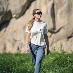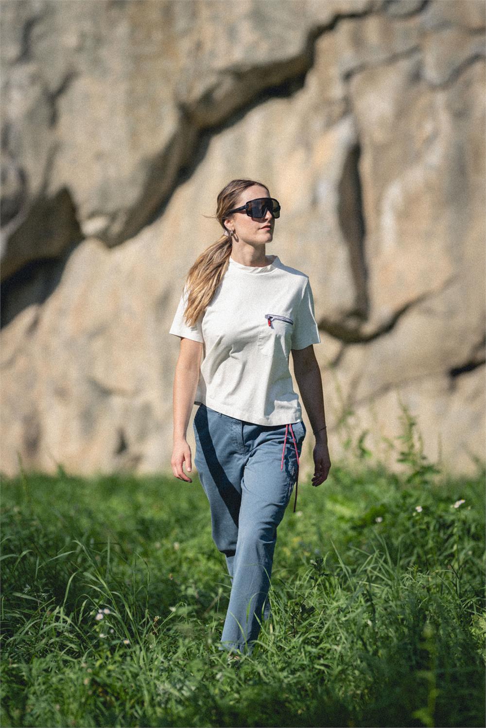 A modern cut and a refined natural fabric define this T-shirt, enhanced by artisanal details that ensure durability and highlight its outdoor spirit. The blend of organic cotton, hemp, and Sorona gives the T-shirt a solid structure and superior breathability, elevating it beyond a standard cotton tee. Combined with its contemporary fit—featuring oversized sleeves and a cropped cut—it’s perfect for everyday wear and outdoor adventures alike. The design is enriched with hand-stitched seams, a contrasting buttonhole, and a V-shaped back opening secured with a loop for added comfort. As with every Avista piece, the signature detail remains: a climbing piton-shaped buttonhole framing the zippered chest pocket, a tribute to the brand’s alpine heritage.