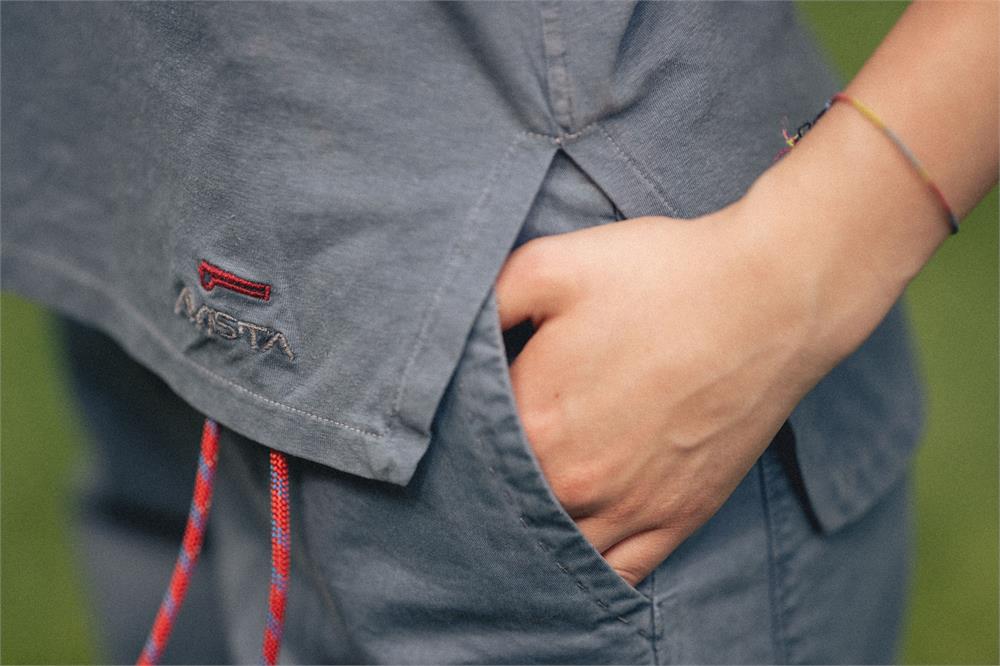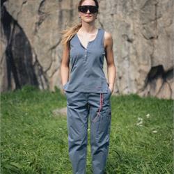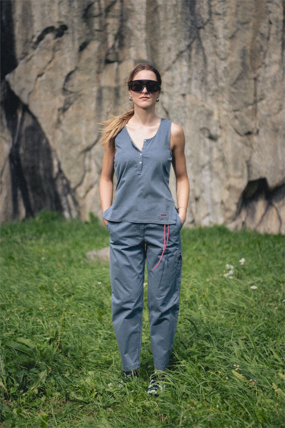 The Avista Tank Top redefines the classic outdoor top with unique details. Crafted from a blend of organic cotton, hemp, and Sorona, this piece offers a solid structure and exceptional breathability, setting it apart from conventional cotton tops. The front features a deep opening with minimal buttons, complemented by refined edging on the straps, thoughtfully designed to ensure bra coverage. The side seam follows a fluid line, creating space around the bust before tapering into a fitted waistline, ending in an asymmetrical slit—longer in the back and shorter in the front—for an elegant yet dynamic effect. The back is distinguished by a diagonal slit, adding a subtle yet distinctive design element. A signature red loop nods to Avista’s signature aesthetic, giving the piece an unmistakable touch. Perfect for those seeking a versatile, stylish, and technical garment, the Avista Tank Top is designed to move with you through outdoor adventures while maintaining the highest standards of quality and design.