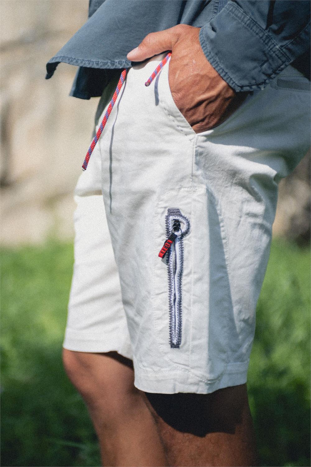 Tailored Short – L’eleganza sartoriale incontra la libertà dell’outdoor Il Tailored Short di Avista porta il design e la cura dei dettagli dei pantaloni sartoriali nel mondo outdoor e del climbing. Un insieme di dettagli lo rendono un prodotto unico nel suo genere, fondendo lo stile e la costruzione dei pantaloni artigianali italiani con le esigenze dell’arrampicata e della vita all’aria aperta. Il taglio richiama quello di un pantalone sartoriale italiano, reinterpretato per offrire un fit moderno e funzionale. Il tessuto, un cotone resistente ed elastico, assicura grande libertà di movimento, ulteriormente amplificata dal cuneo sottogamba, progettato per supportare movimenti ampi e laterali. La struttura della vita è articolata ed elasticizzata, con un elastico interno che garantisce comfort e adattabilità. Le finiture sartoriali includono un bordino chiuso a punto filza e uno spacchetto posteriore per una maggiore libertà di movimento. Un pannello interno copre la patta e la cucitura del cavallo, migliorando la vestibilità e la pulizia estetica del capo. Per la chiusura è stato scelto un doppio bottone in vita, affiancato da un cordino in Kevlar da arrampicata, regolabile tramite una placchetta minimale. Il sistema di doppia apertura nei passanti impedisce al cordino di risalire, mantenendolo sempre in posizione, anche quando il pantalone è indossato con un fit oversize. Le due tasche mani e le due tasche posteriori a filetto con tondino ribattuto completano il design, offrendo praticità senza compromettere l’estetica raffinata del capo. Tutte queste caratteristiche permettono di indossare il Tailored Short con un fit più slim o più oversize, senza mai rinunciare a comfort e prestazioni. Il tratto distintivo che ricorre in ogni capo Avista è l’asola a forma di chiodo d’arrampicata che racchiude la zip posta sulla coscia sinistra.